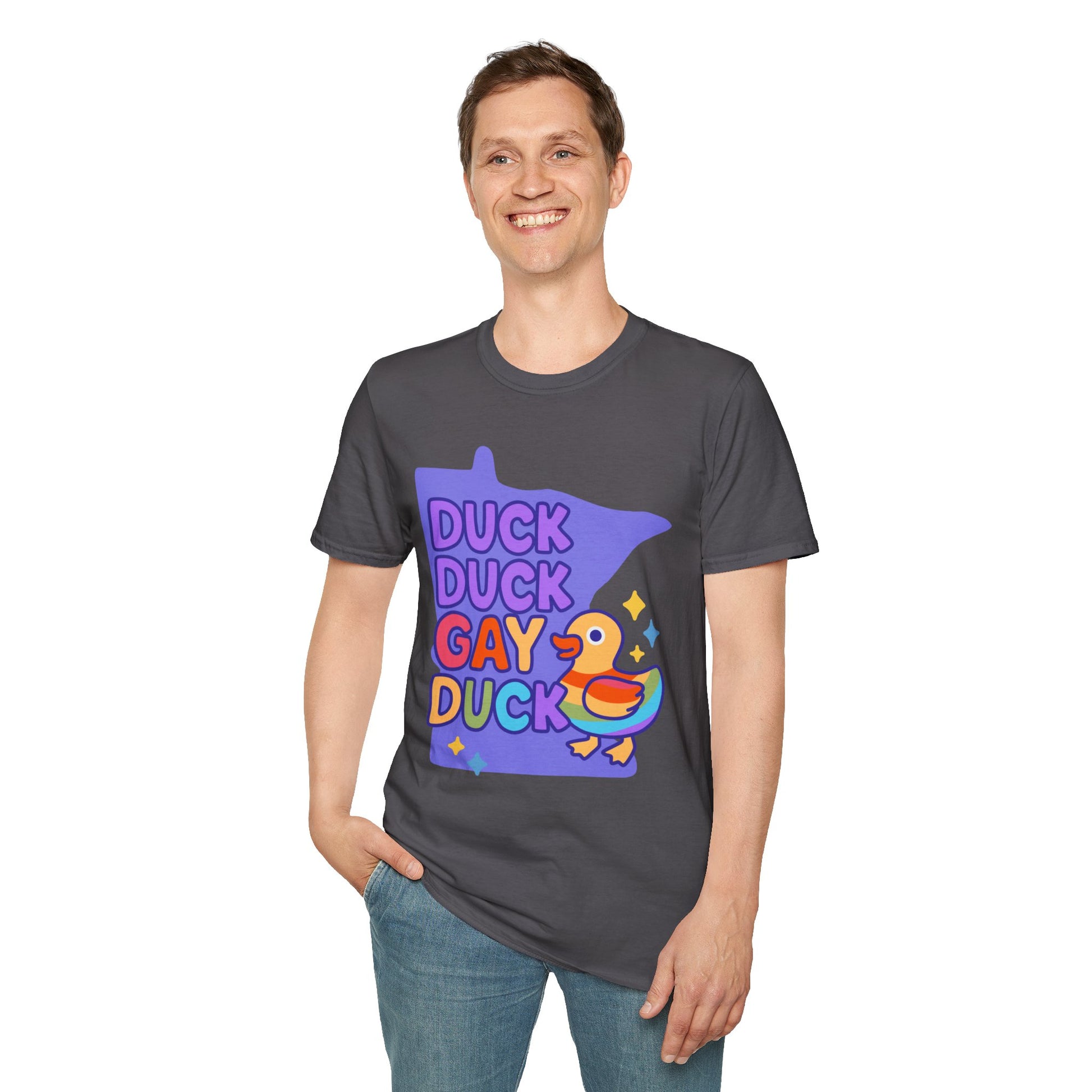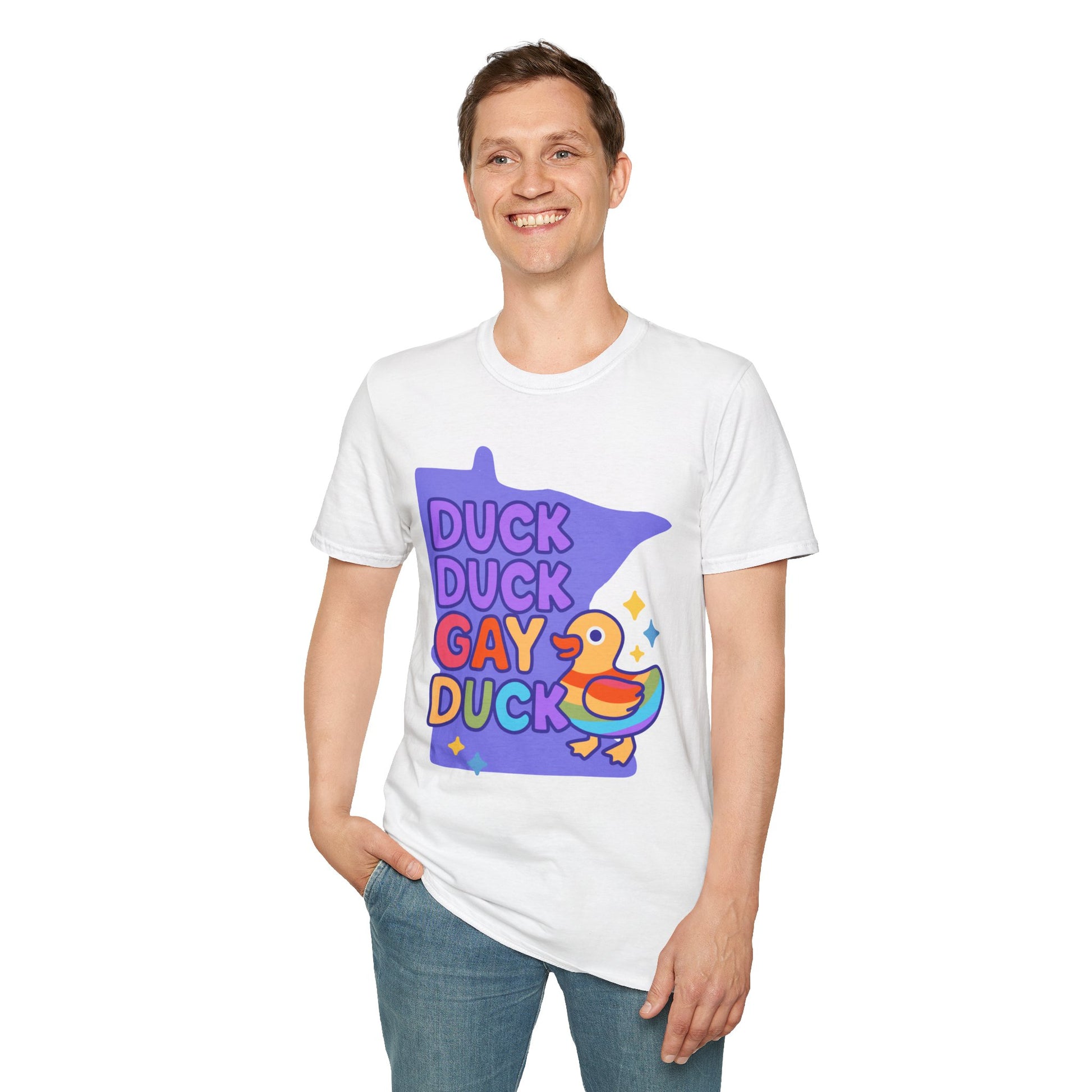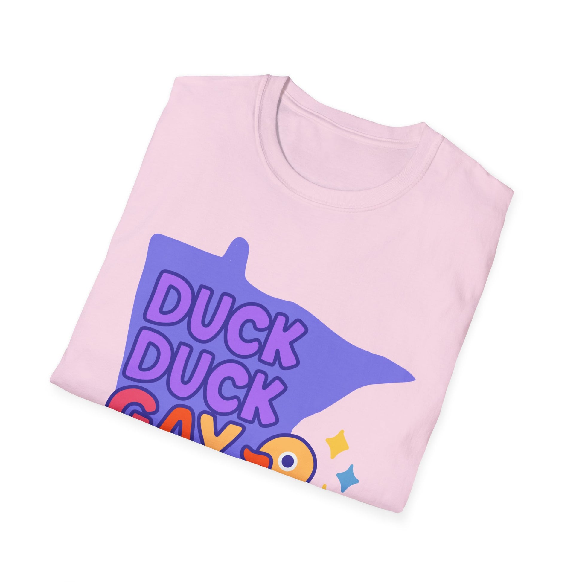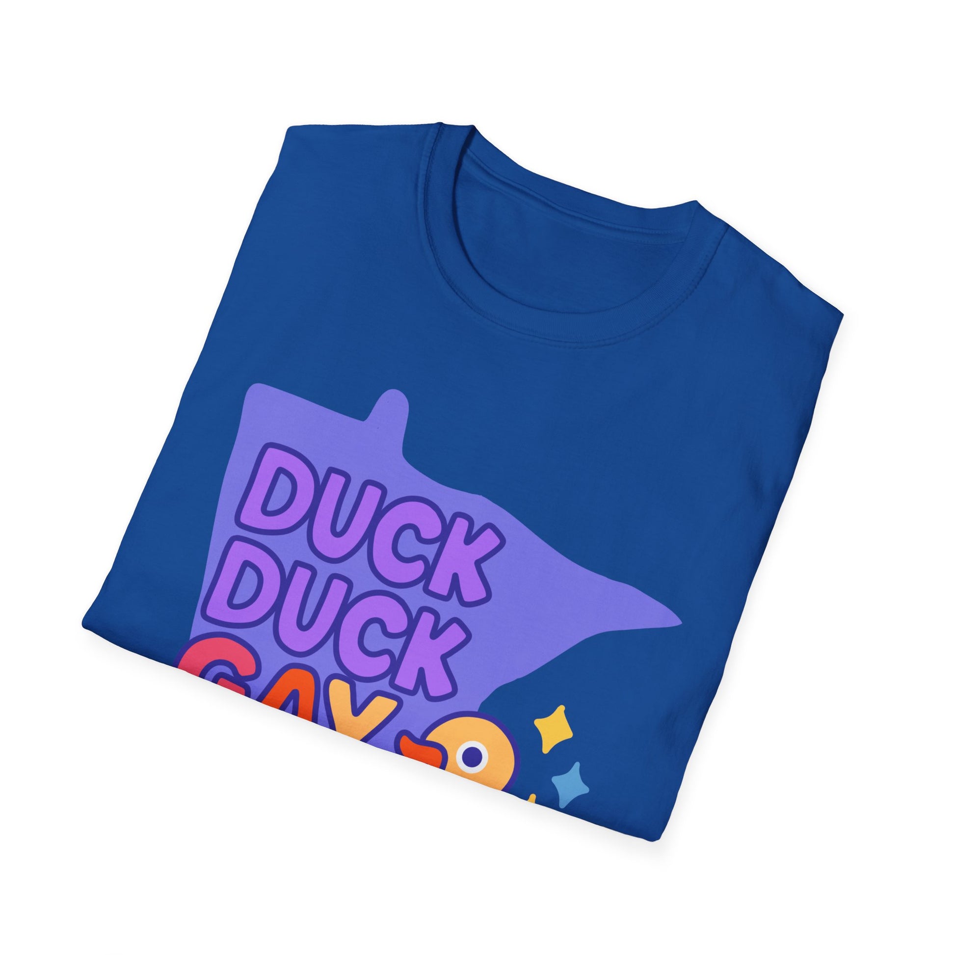 Introducing our Unisex Softstyle T-Shirt, designed to bring a splash of joy and color into your wardrobe! This playful tee features a vibrant "Duck Duck Gay Duck" graphic, perfect for anyone embracing their unique identity and celebrating diversity. The soft, lightweight fabric feels heavenly against the skin, making it suitable for year-round wear. This shirt is a fantastic choice for casual outings, pride celebrations, or just lounging at home. Whether you're gathering with friends or attending a community event, this t-shirt adds a fun twist to any occasion. Ideal for fashion-forward individuals of all ages, this t-shirt makes a great gift for birthdays, LGBTQ+ pride events, or simply for someone who loves quirky designs.