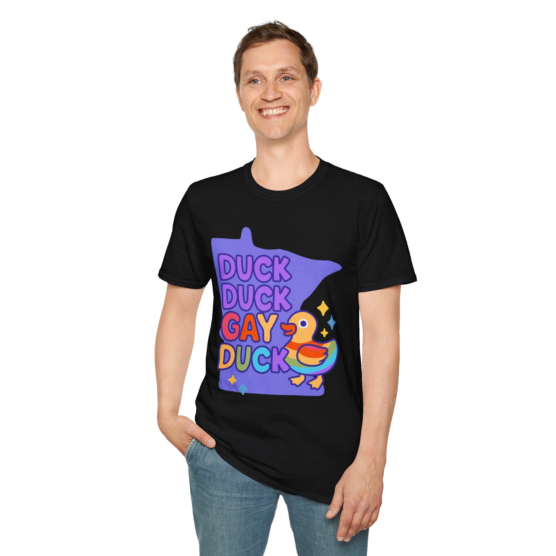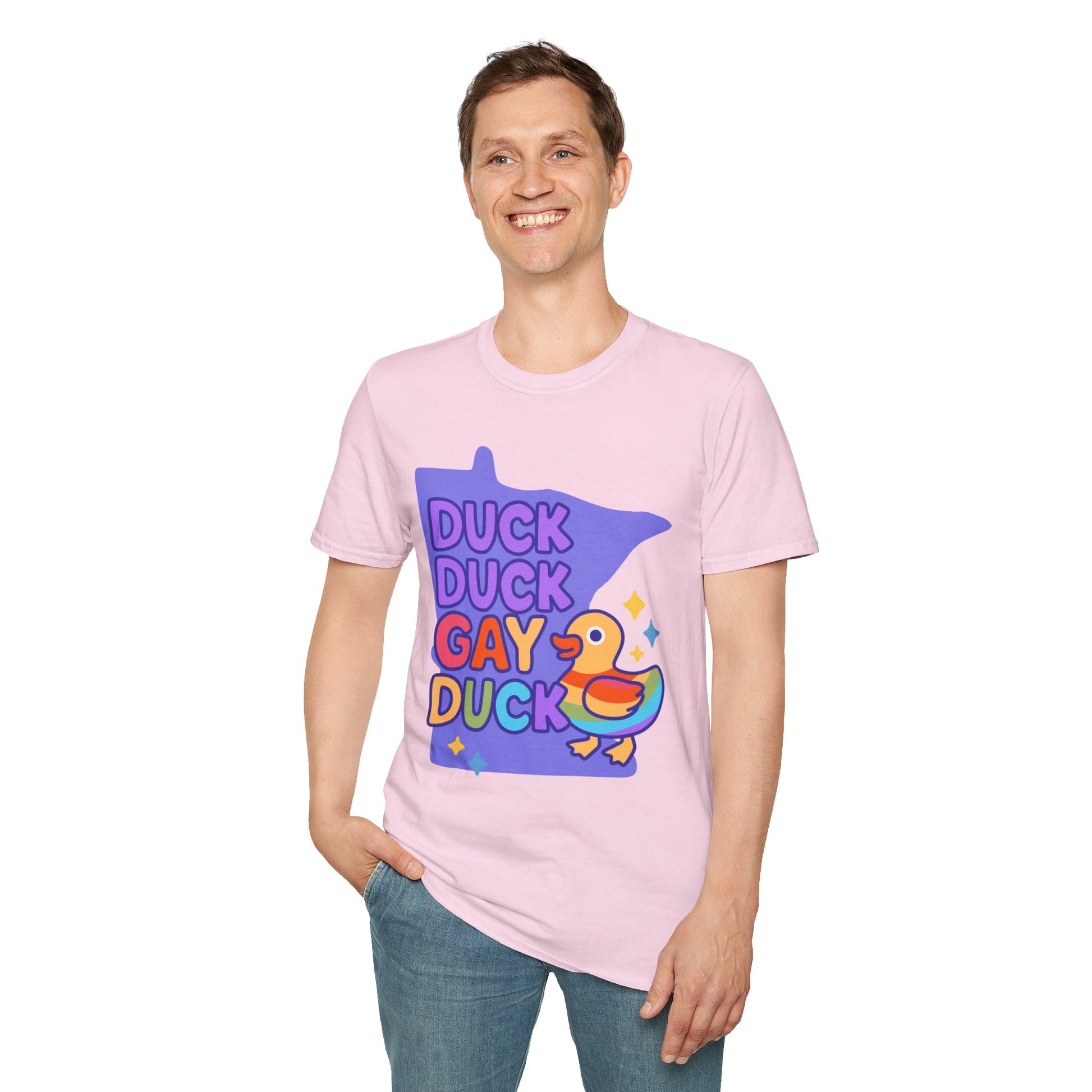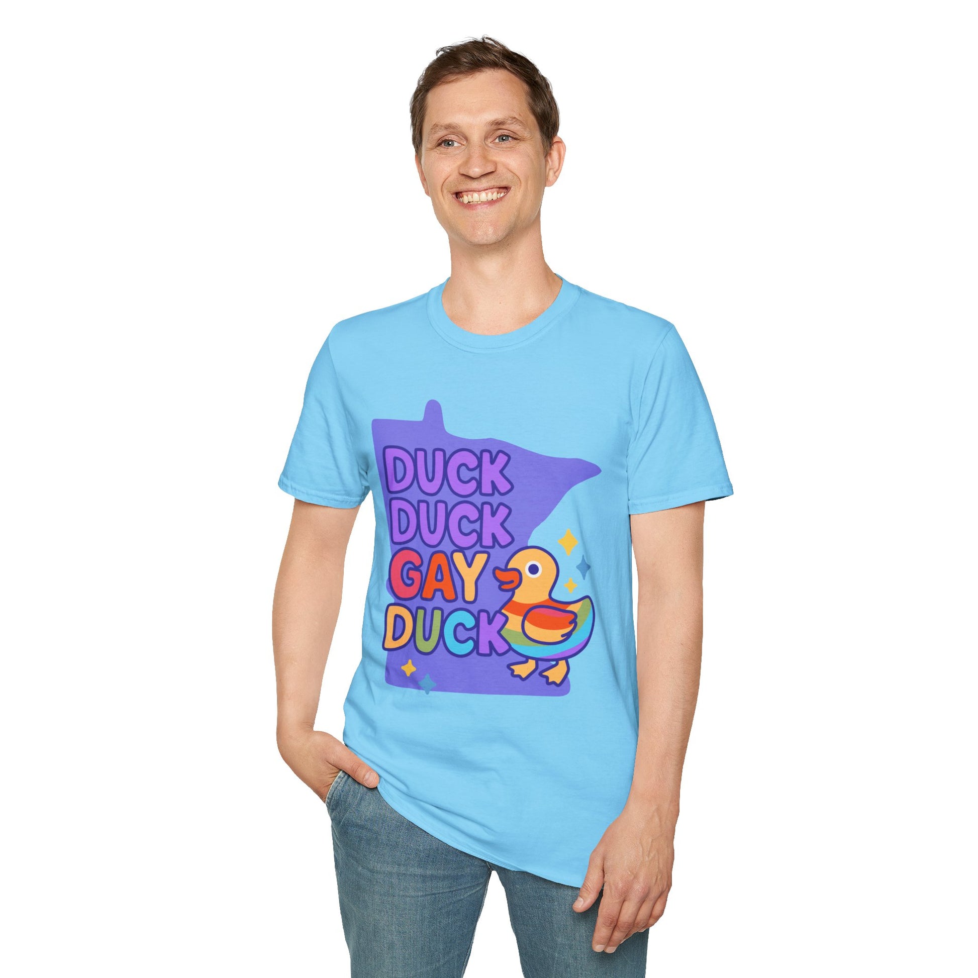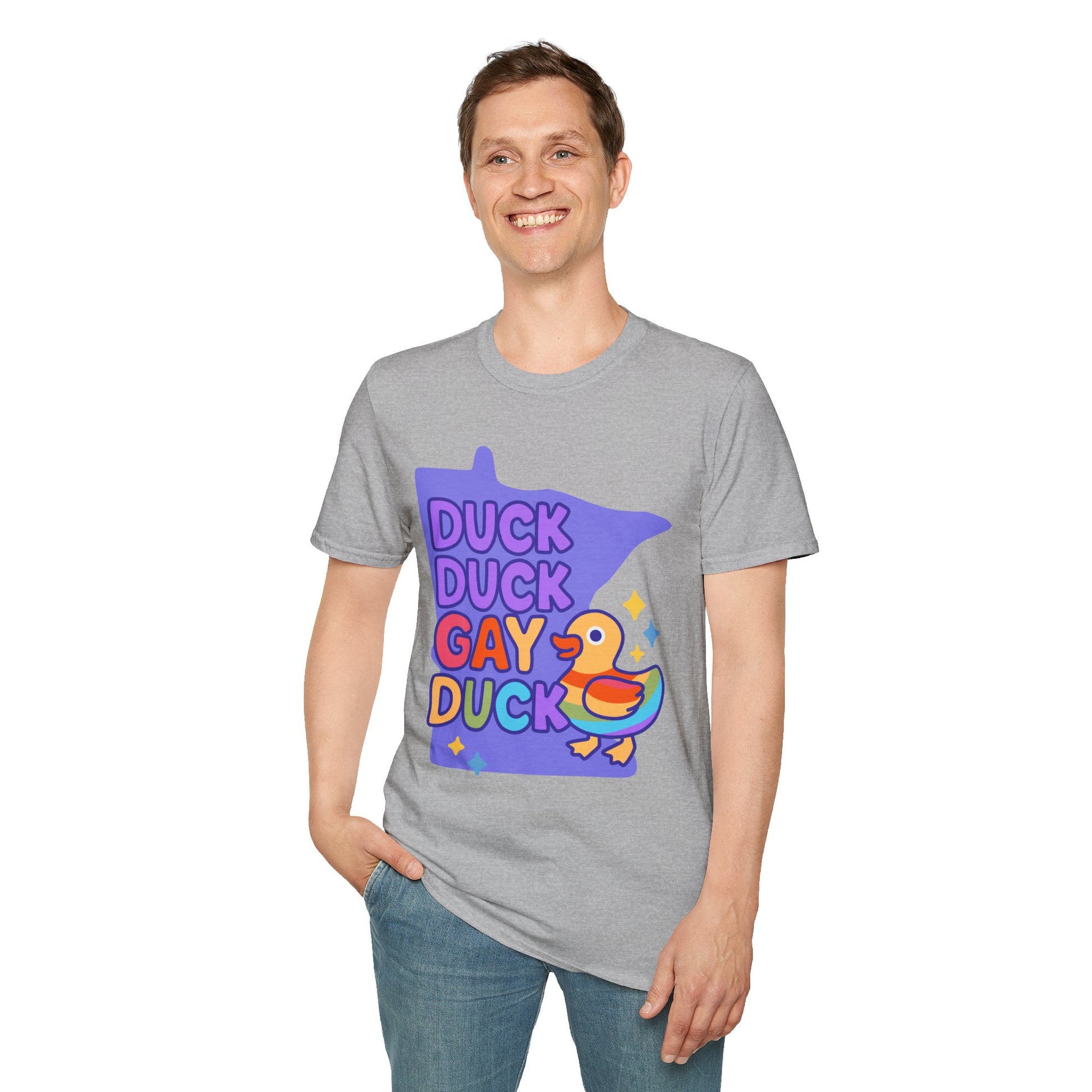 Introducing our Unisex Softstyle T-Shirt, designed to bring a splash of joy and color into your wardrobe! This playful tee features a vibrant "Duck Duck Gay Duck" graphic, perfect for anyone embracing their unique identity and celebrating diversity. The soft, lightweight fabric feels heavenly against the skin, making it suitable for year-round wear. This shirt is a fantastic choice for casual outings, pride celebrations, or just lounging at home. Whether you're gathering with friends or attending a community event, this t-shirt adds a fun twist to any occasion. Ideal for fashion-forward individuals of all ages, this t-shirt makes a great gift for birthdays, LGBTQ+ pride events, or simply for someone who loves quirky designs.