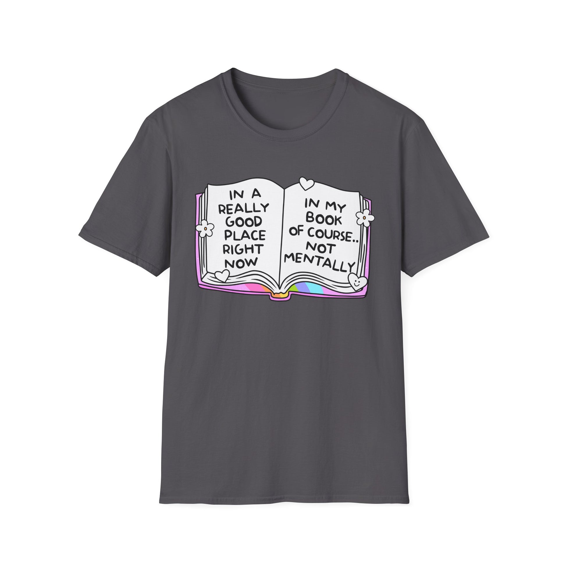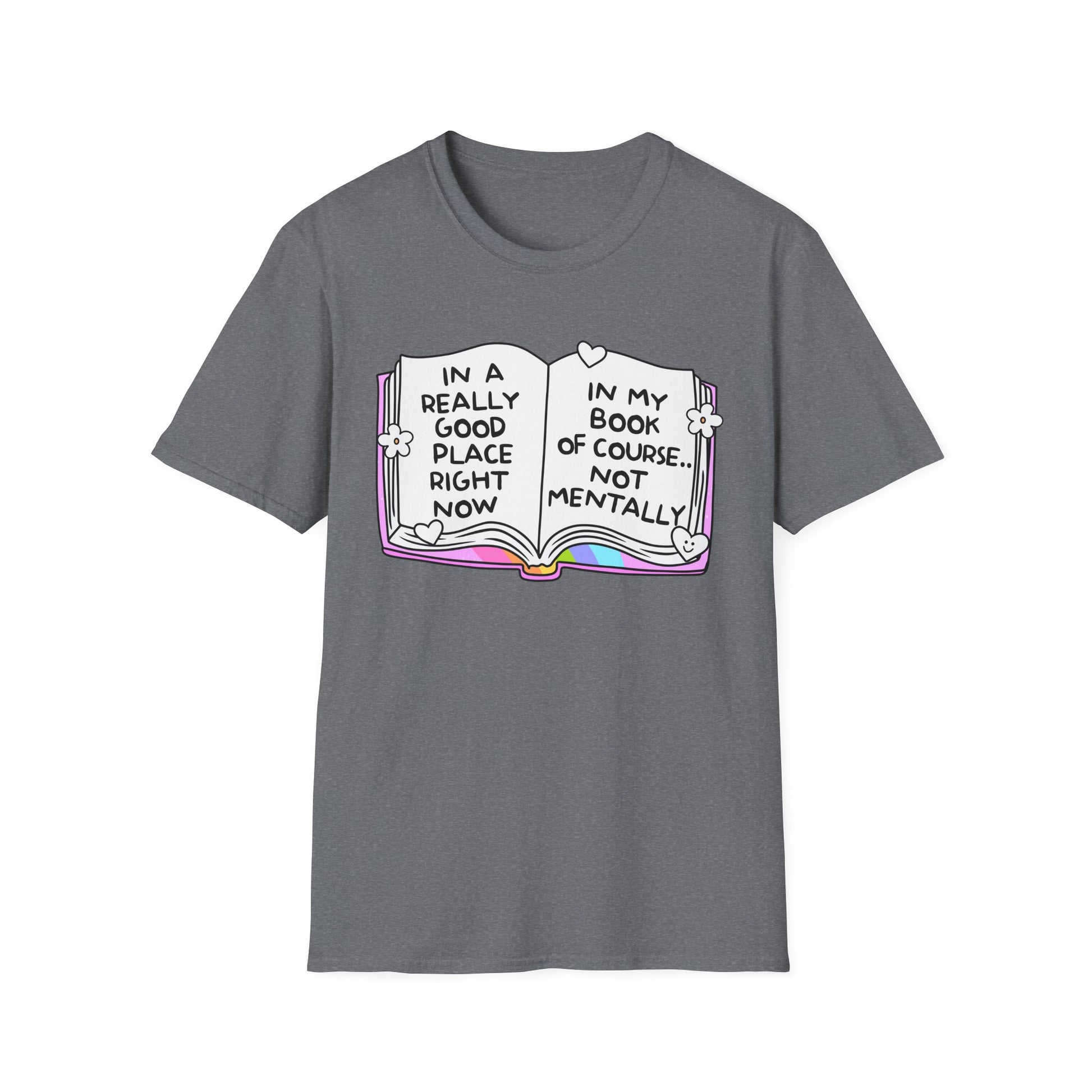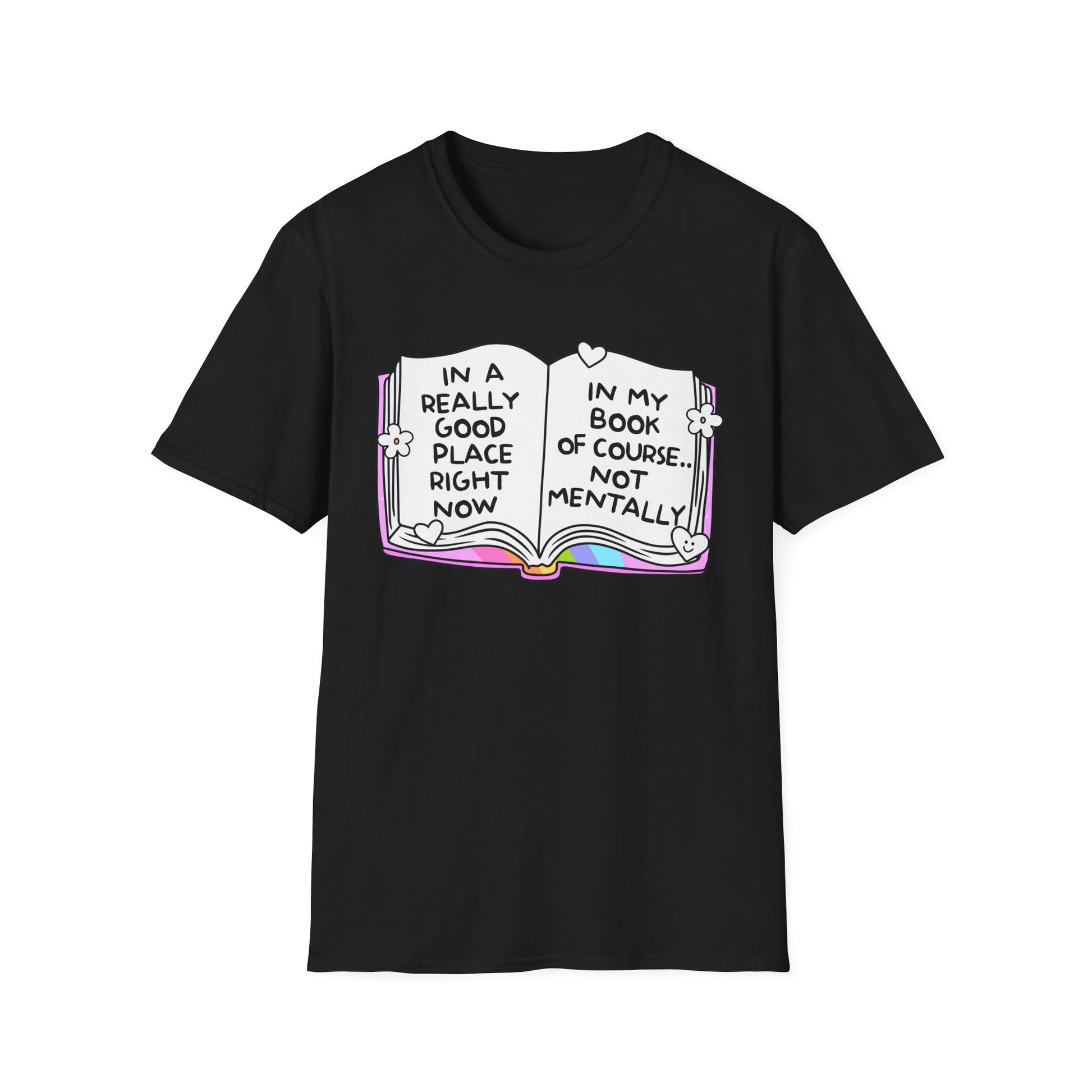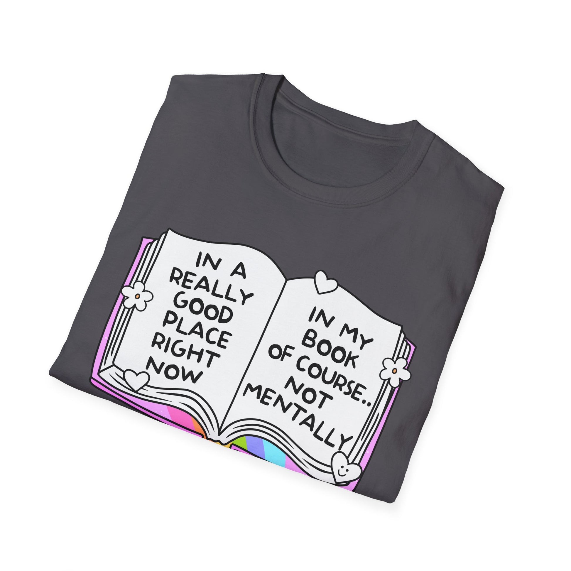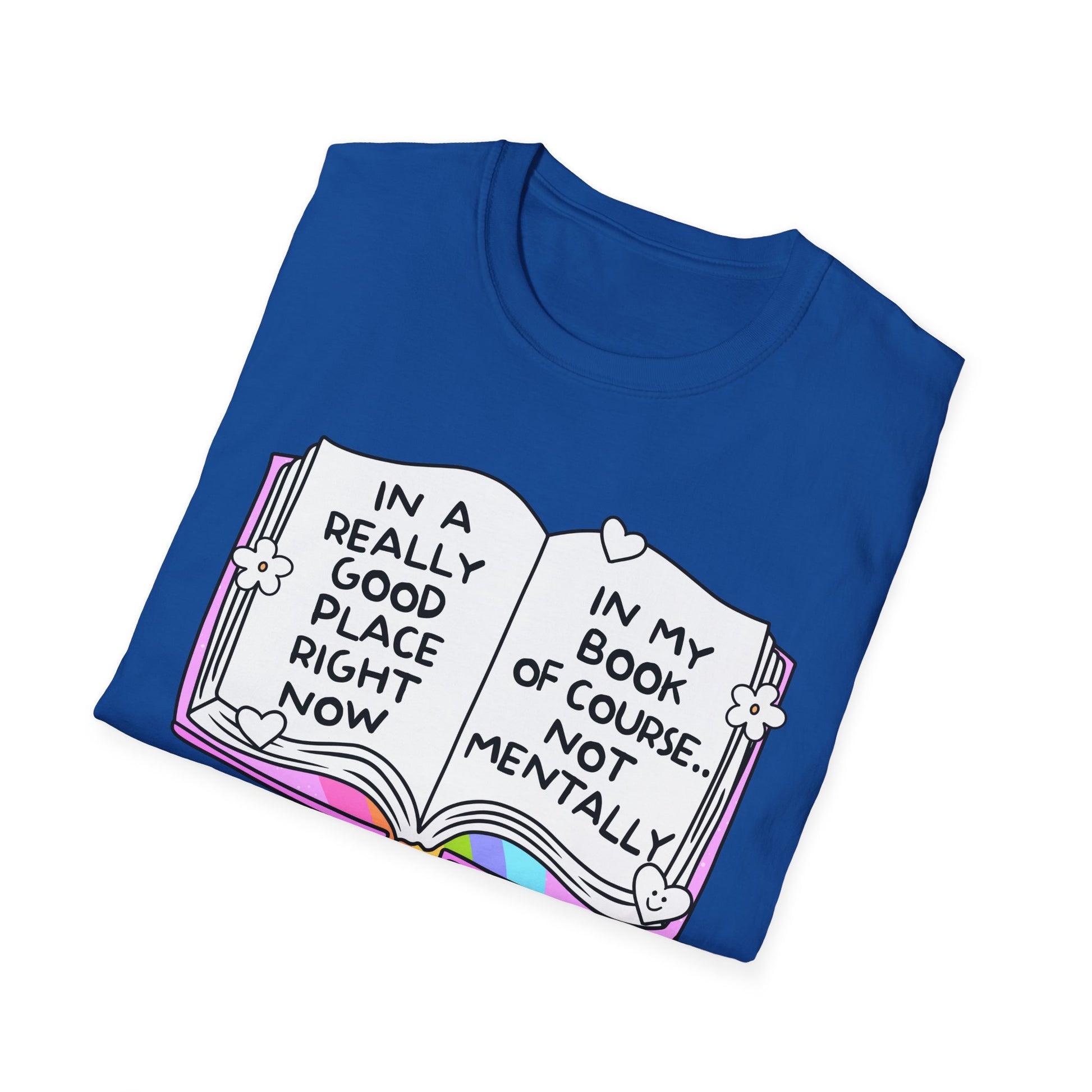 Let’s be real: mentally? Chaos. But in your book? You’re thriving. This soft, comfy tee features an open book with rainbow accents and the painfully relatable quote: “In a really good place right now… In my book of course. Not mentally.” Perfect for book lovers, anxious gremlins, and anyone surviving on fiction and vibes. Wear it to signal you’re doing just fine—as long as we’re talking about fictional worlds.